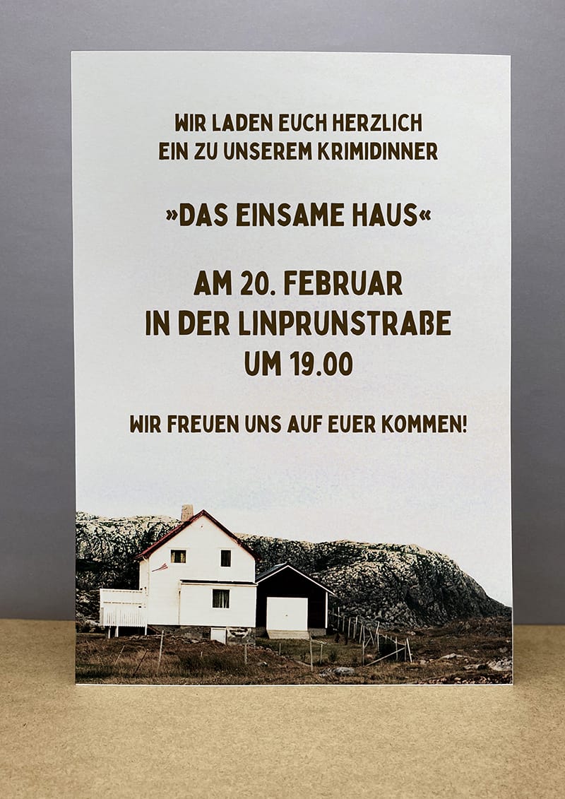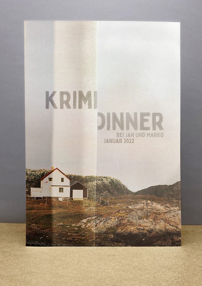 Entwurf für Einladungskarten für ein Krimidinner. Die Einladungskarten haben Postkartengröße.